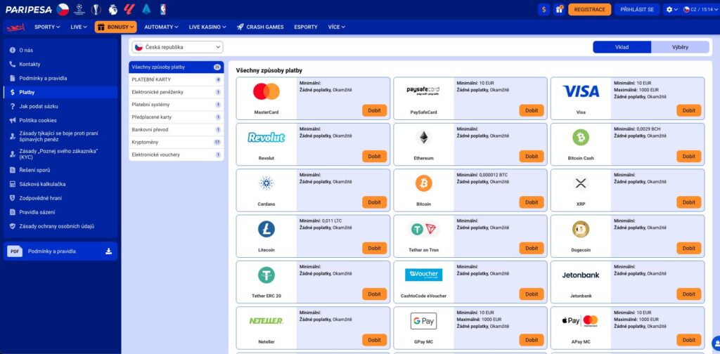 Vklad nebo výběr je možné provést prostřednictvím vybraných platebních systémů. Podle PariPesa kasinové recenze jsou dostupné metody Visa, Mastercard, Paysafecard, Revolut nebo kryptoměny Bitcoin, Litecoin, Cardano, Ethereum a další. Nechybí ani vybrané mobilní metody, například Apple a Google Pay nebo peněženky Neteller a Skrill. Limity na peníze se různí podle úrovně ve věrnostním programu.
